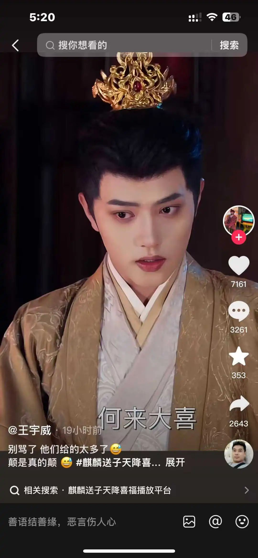蓝鲸新闻查询发现,“1胎99子”的剧情出自短剧《麒麟送子天降喜福》,根据剧情,女主意外怀上“龙种”,并在临盆时出现麒麟踏云送子的超自然现象,最终诞下99个孩子。这部短剧共68集,截至18:00在短视频平台累计播放量已经超过4500万。蓝鲸新闻记者发现,截至记者发稿,该短剧已在短视频平台下架。