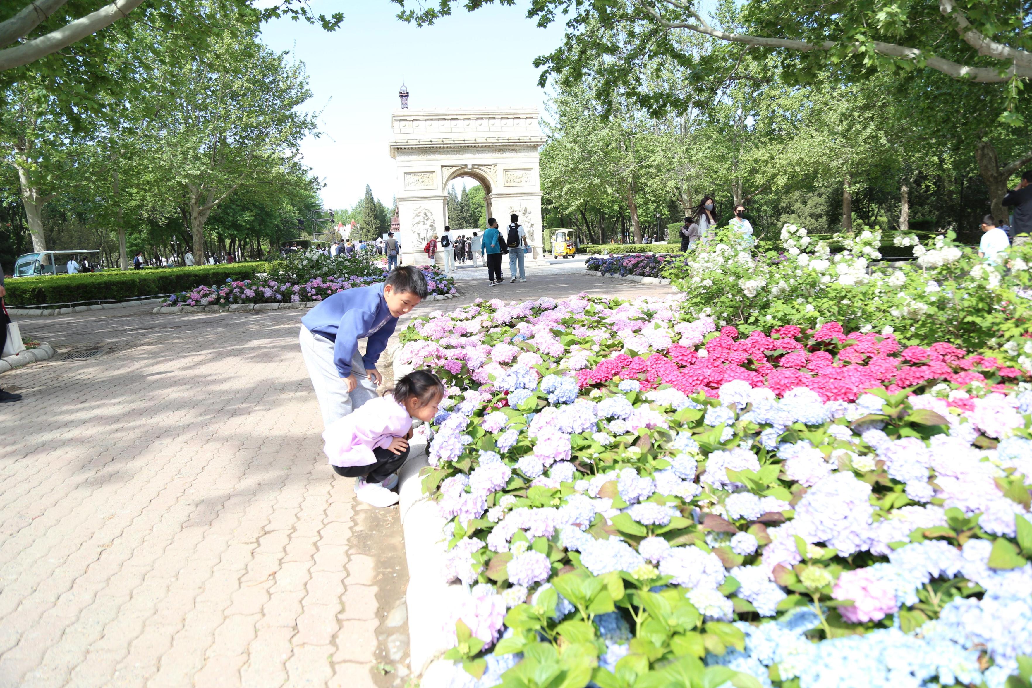 除了演出和活动,世界公园里的花草设计也别具匠心,大片大片玫红色、橘黄色、金黄色的郁金香,热烈而绚烂,犹如彩霞一般,凯旋门附近的绣球花开得正好金富宝,浪漫的花朵与周边建筑相映成趣,打卡拍照不容错过。
